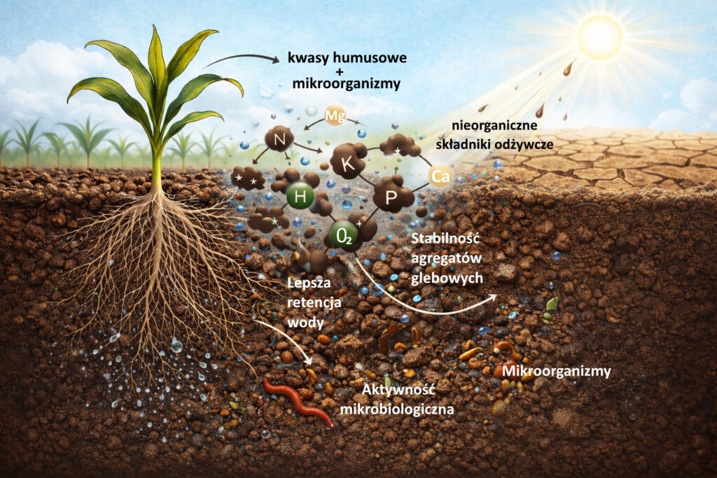 Kwasy humusowe wspierają tworzenie i stabilizację agregatów glebowych (gruzełków), co w praktyce oznacza: